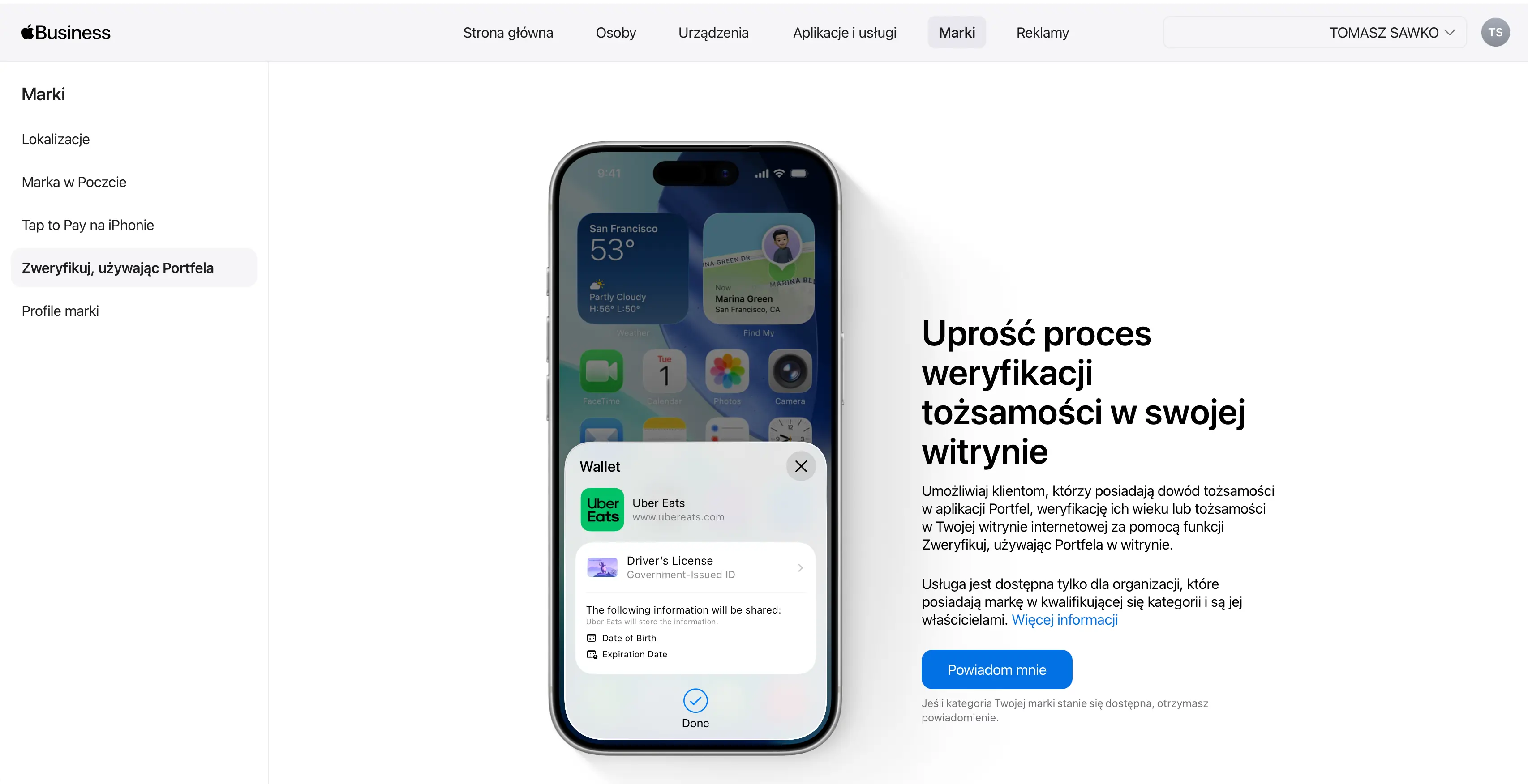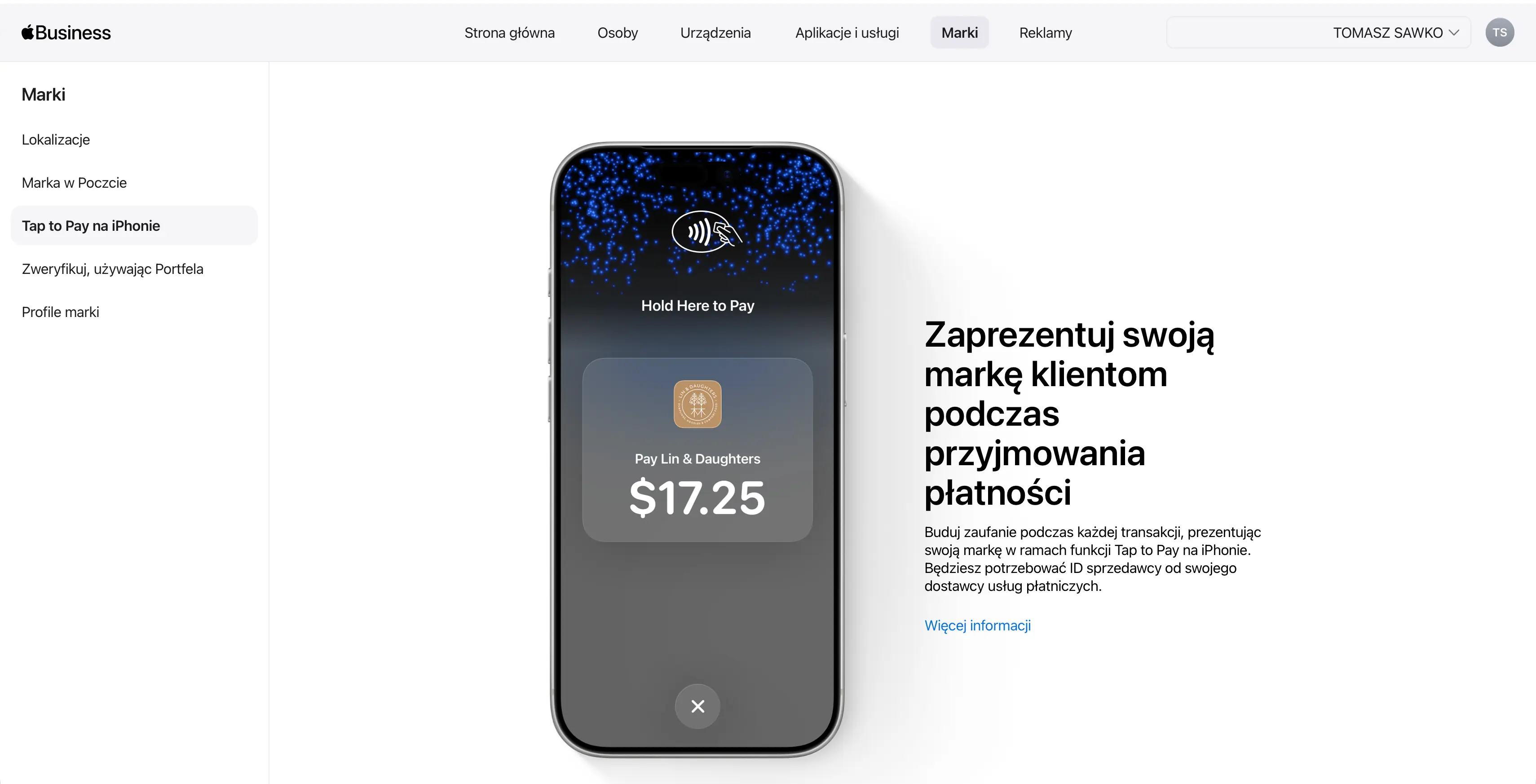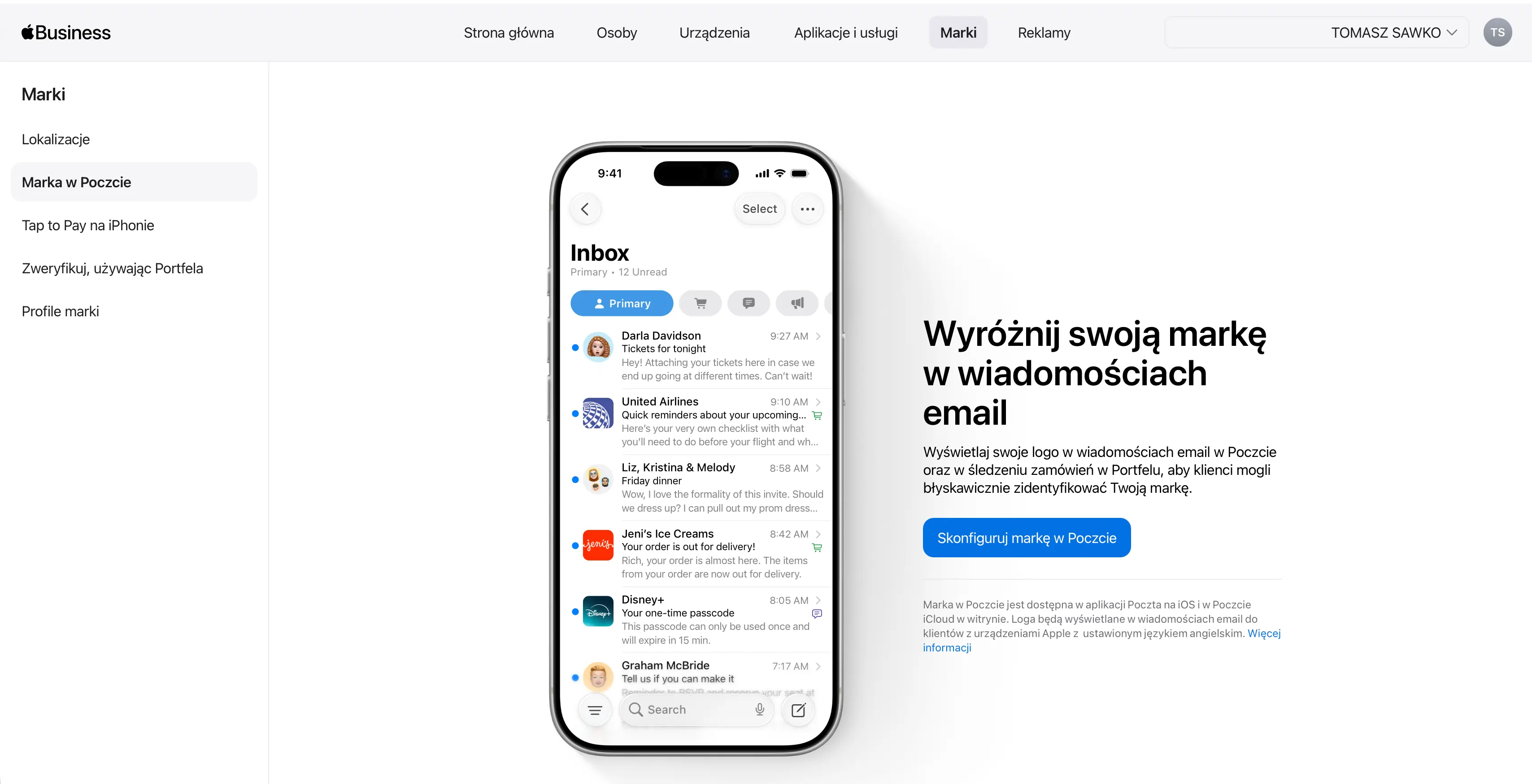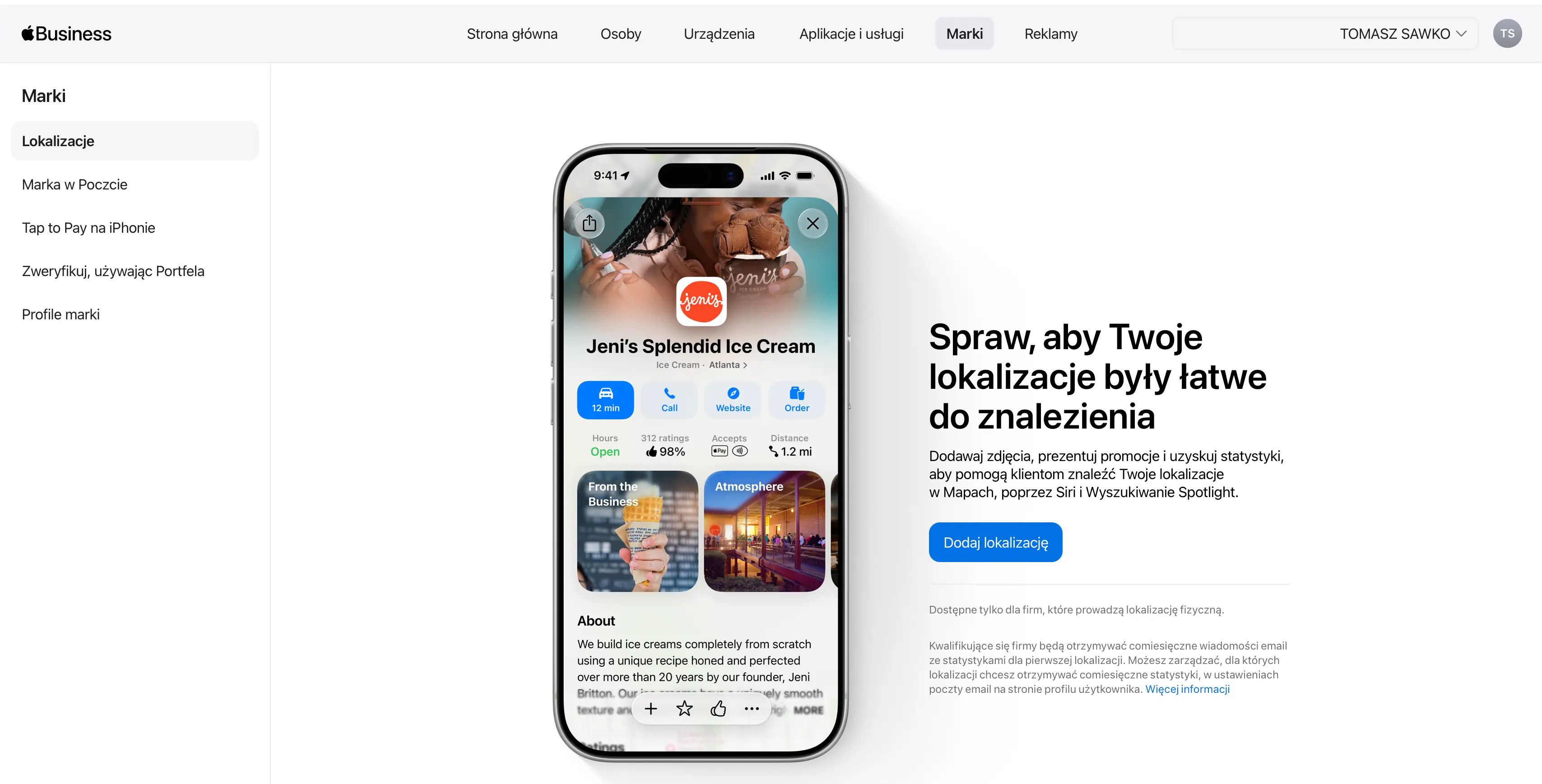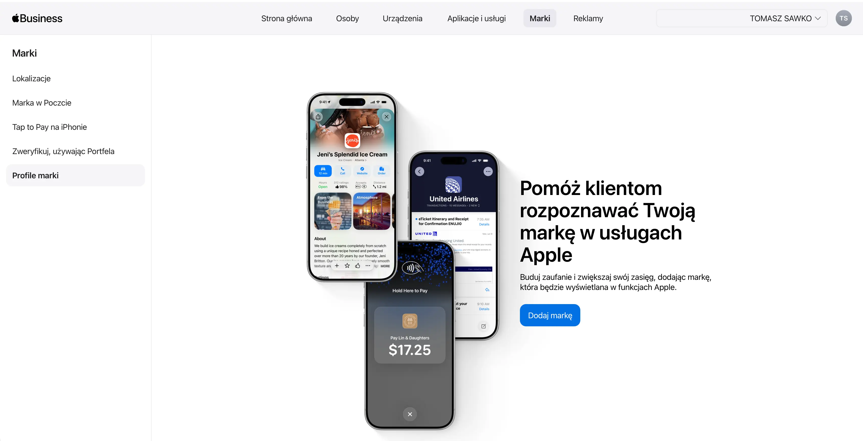 Konsolidacja wchłonęła też dawne Apple Business Connect. Znajdziecie tu narzędzia do zarządzania wizerunkiem firmy w Mapach Apple, Wallet czy w Apple Mail. Dodajecie logo, zdjęcia, godziny otwarcia, czy akcje typu „Zarezerwuj”.